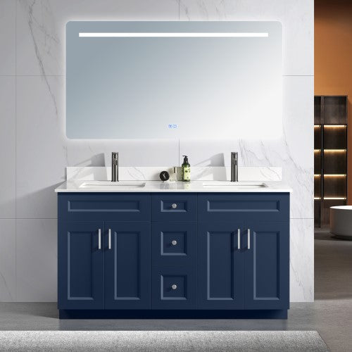 60" Inch Double Sink Solid Wood Blue Shaker Style Vanity With Quartz Top