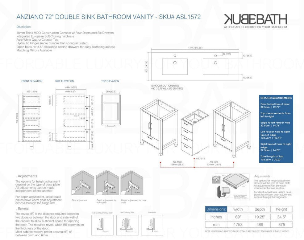The Anziano Bathroom Vanity provides a contemporary design perfect for any bathroom remodel. The ample storage in this free-standing vanity includes four doors and six fully functional drawers lining the cabinet, with chrome hardware accents. The pure white Quartz countertop it is made using nano technology, that makes it virtually impenetrable and maintenance free.