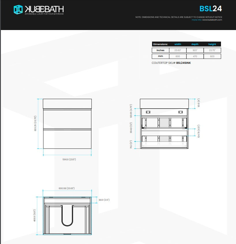 The Bliss is one of the most elegant modern Bathroom Vanities around. This 24 Inch model comes with a reinforced Acrylic sink, Marine Wood Veneer Constructed Console that is fully moister and water proof, with high quality European Hardware, that provides smooth soft-closing operation drawers.