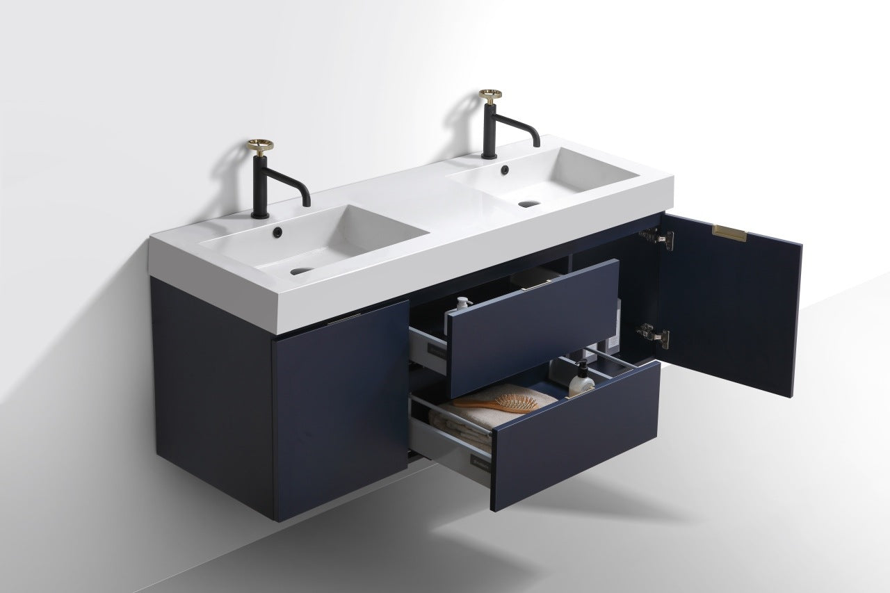 Bliss 60″ Inch Navy Blue Wall Mount Double Sink Modern Bathroom Vanity