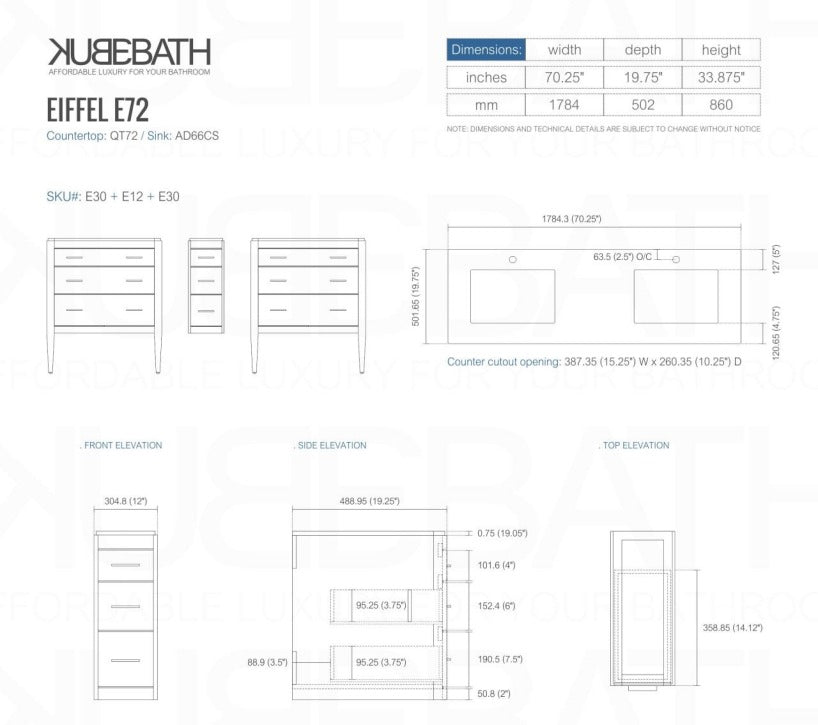 Inspired by both the art deco movement of the ’20s, ’30s, and ’40s and the elegant simplicity of European design, the Eiffel Bathroom Vanity was created from responsibly sourced Solid Wood. Each piece is assembled using intricate shapes that slot together forming a sturdy yet graceful structure. The Eiffel 72″ Double Sink Vanity features seven fully functional drawers, a pure white countertop with white Ceramic under mount Sinks. The cabinet is finished in a white lacquer paint finish, while the inside of the drawers is varnished, with the natural wood color exposed.