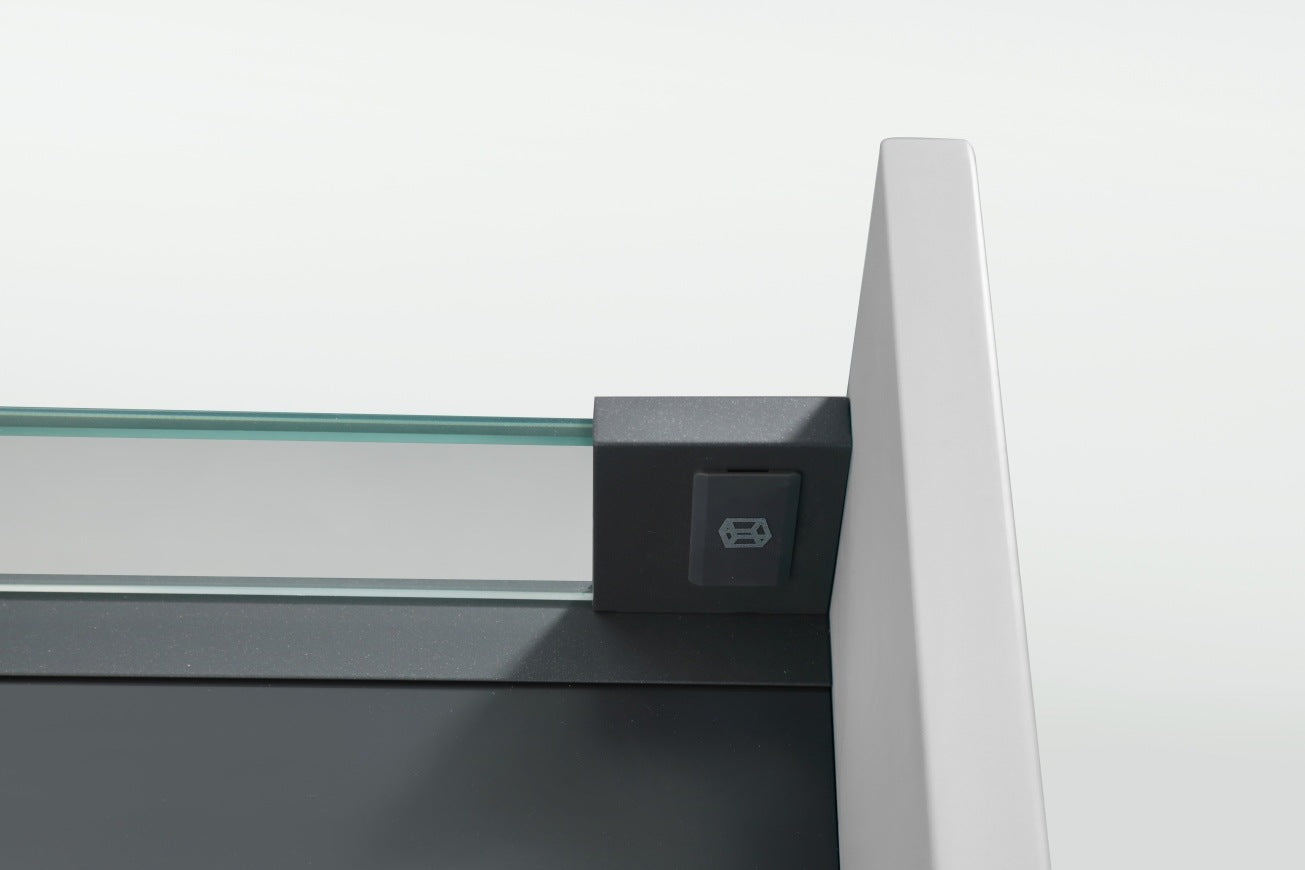 It features four fully functional, smooth glide, soft-closing metal box drawers, with glass side details.