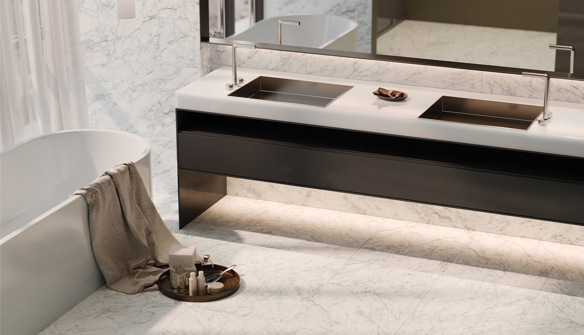 A thin, homogeneous, and compact pattern defines the delicate and beautiful veining of Carrara Gioia. An accurate reproduction of the iconic Carrara marble can complement most interiors in a natural and ultra-realistic fashion. Beautiful and luxurious, Carrara Gioia features a bright white-to-grey color palette with subtle yet complementary soft blue-grey veining.