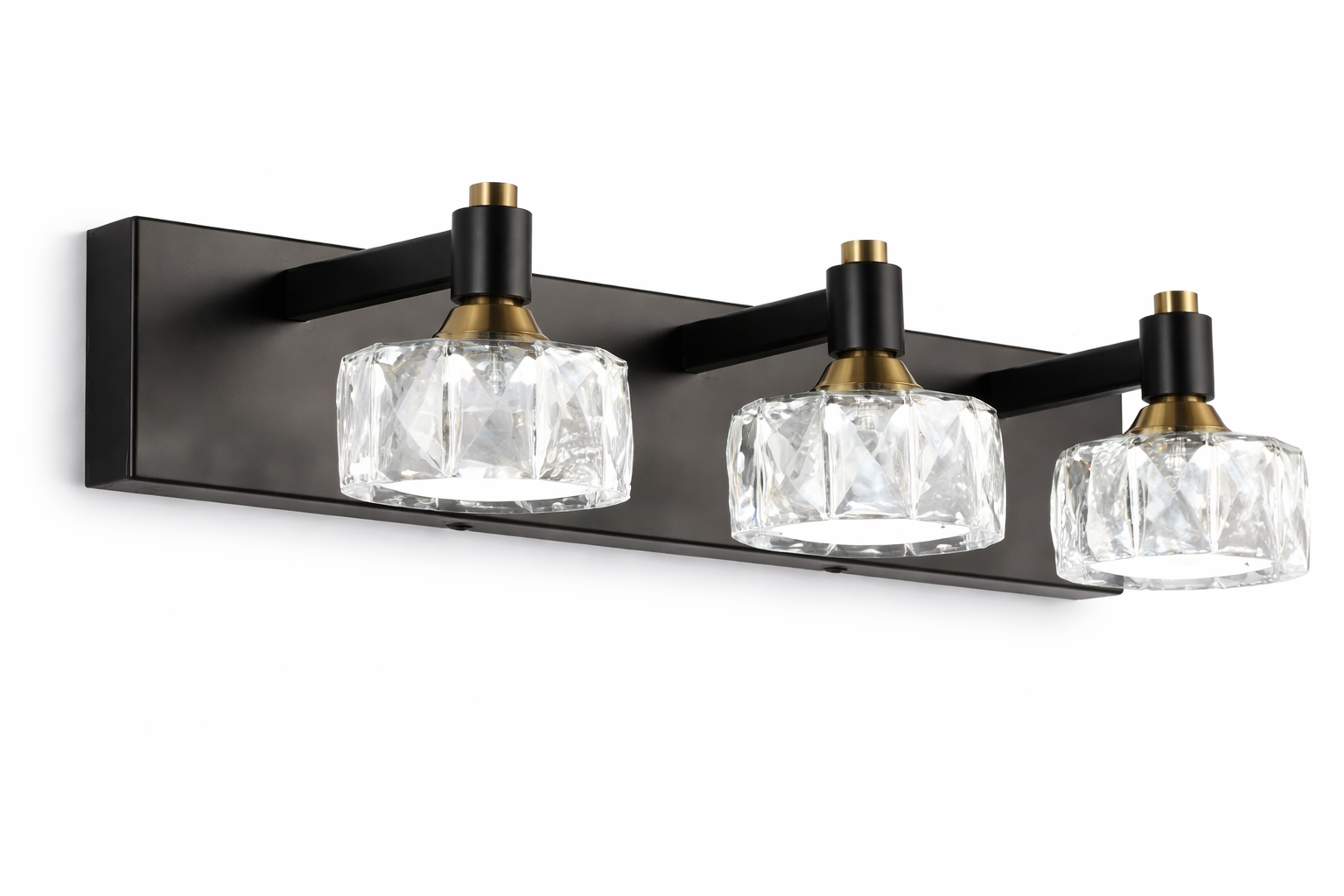 Add a bold yet elegant touch to your bathroom or vanity space with this modern 3-light vanity fixture. Featuring a matte black backplate and arms accented with warm brass detailing, this light is paired with clear faceted crystal glass shades that reflect and enhance illumination beautifully.