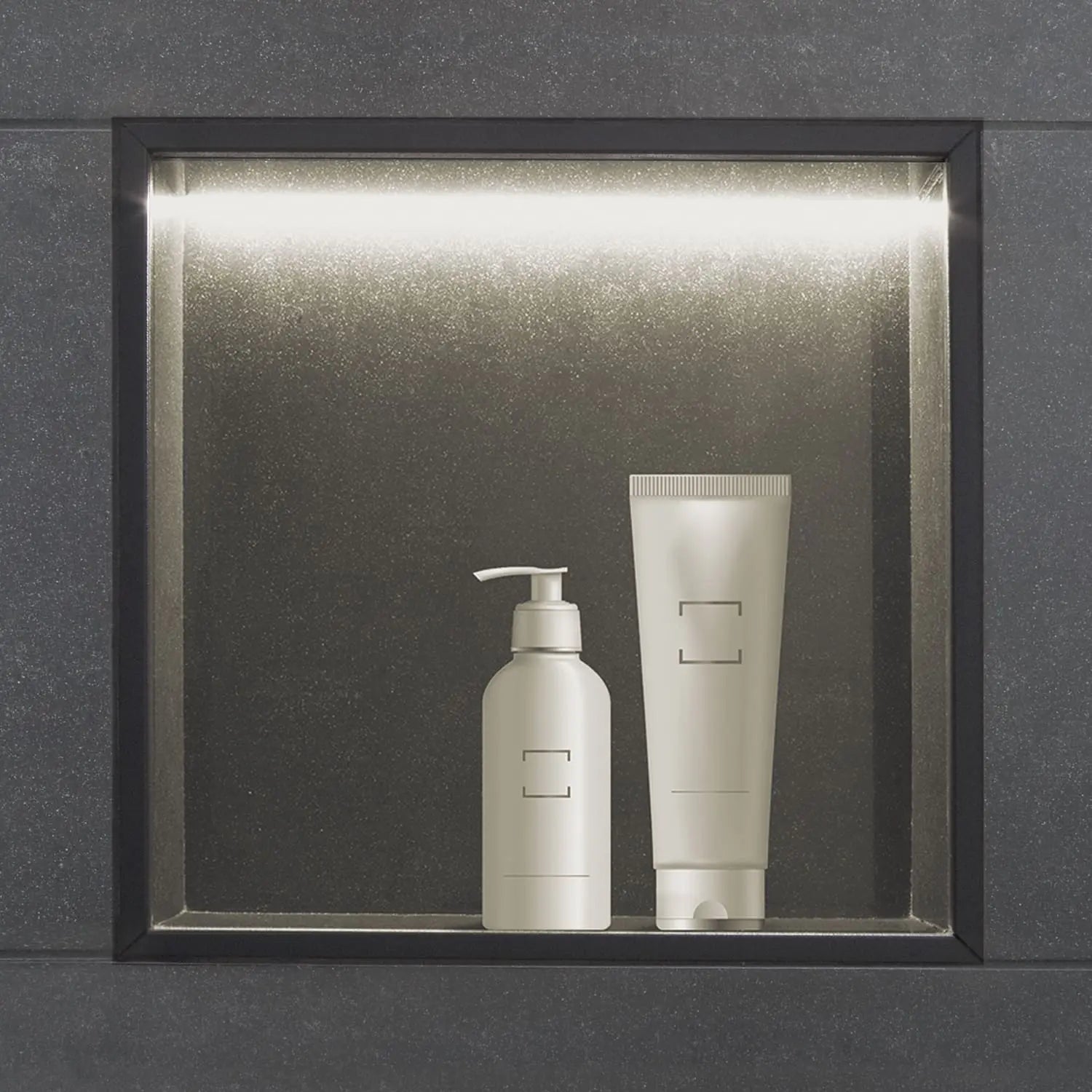 The Schluter®-KERDI-BOARD-SNLT shower niche with integrated Schluter®-LIPROTEC LED lighting is comprised of three key components designed to integrate for a code-compliant installation: the shower niche with LED light strip, the power supply/driver, and the connection cable.