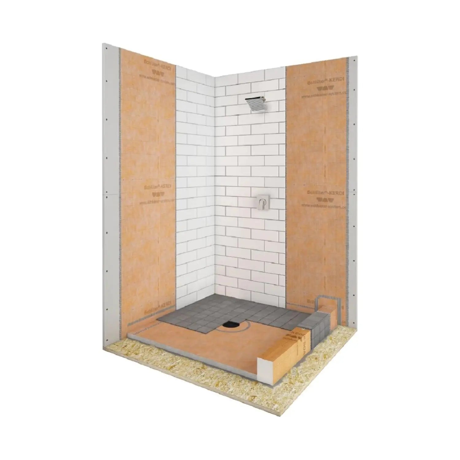 - Contains shower tray, shower curb, waterproofing membrane, KERDI-DRAIN flange, and waterproofing strips, formed corners, pipe seal, and mixing valve seal