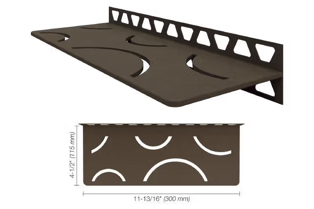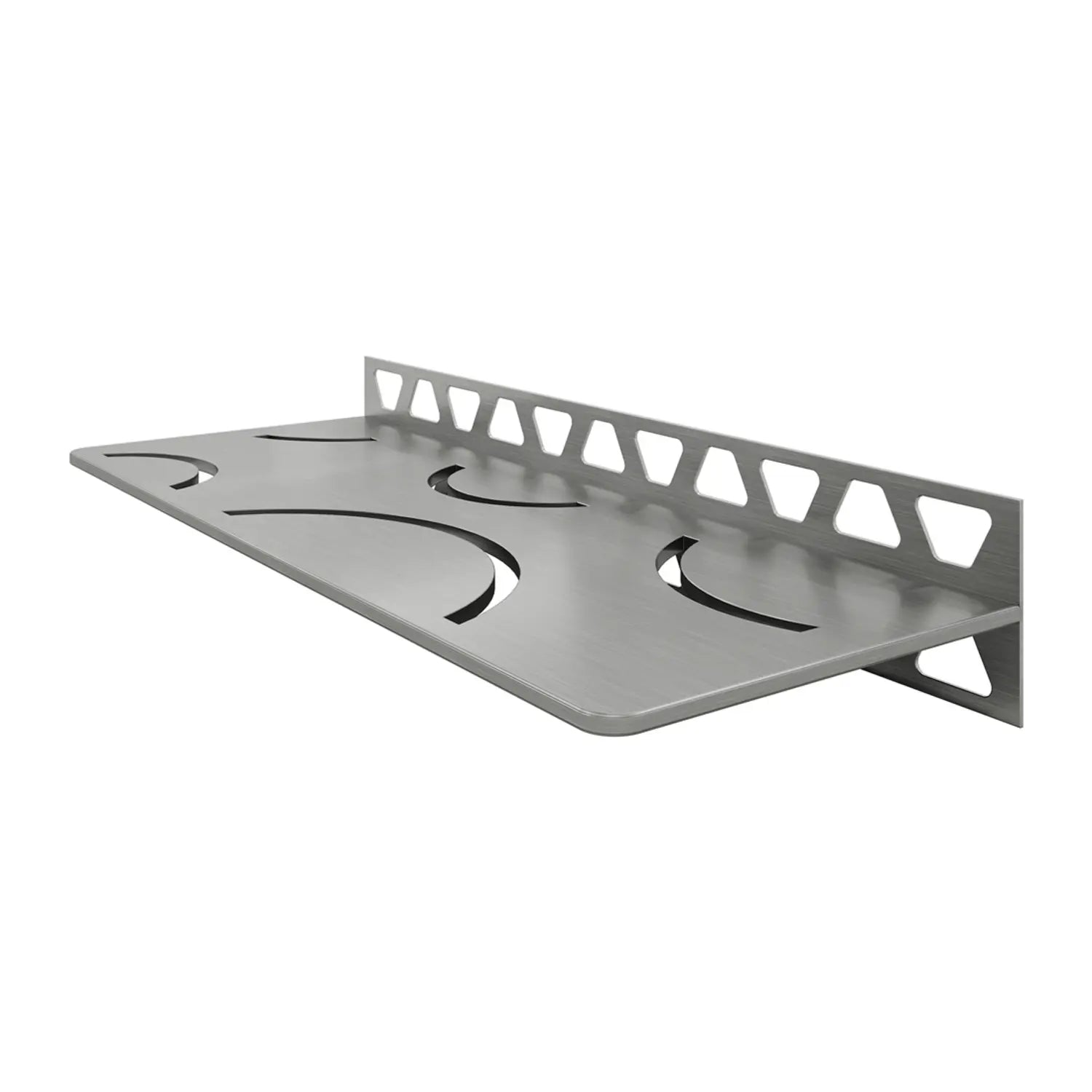 The Schluter®-SHELF-W is a rectangular shelf for tiled walls with two trapezoid-perforated anchoring legs for installation while tiling.
