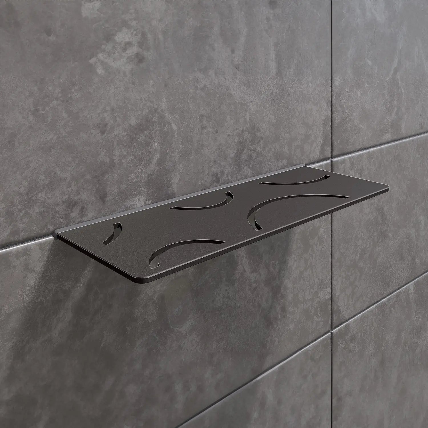 Schluter®-SHELF-W is a wall storage system available in brushed stainless steel or aluminum in a range of textured colour-coated finishes including stone grey, pewter, cream, ivory, greige, bronze, dark anthracite, matte black, and matte white. The shelves are 5/32″ (4 mm) -thick and feature designs coordinating with the KERDI-DRAIN and KERDI-LINE drain grates. They can be used in showers and other tiled wall applications (e.g., kitchens and baths). SHELF-W is a rectangular shelf with two trapezoid-perforated anchoring legs for installation on walls in conjunction with the tile.