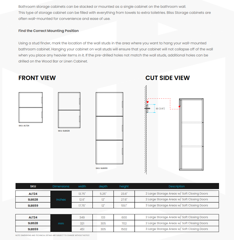 The Bliss Linen Side Cabinet features two doors with integrated Soft-Closing hardware and two large storage areas to store bathroom essentials. It is perfect to store large towels and tall bottles. It matches nicely with any same finish Vanity.