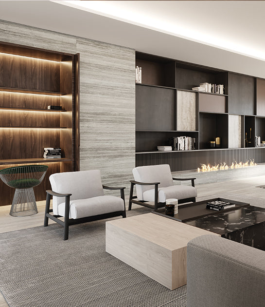 The warm and inviting earthy tones of Travertino Instrata have a rich color range of creamy whites, soft beiges, and layered chocolate browns, with unique veins and markings. Its multi-layered appearance makes it perfect for modern architectures and contemporary scenarios.